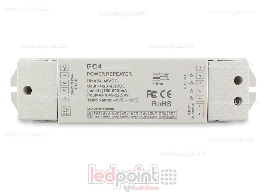 Amplificador de señal corriente constante, 24-48V con 4 canales de 150-500mA. Compatible con tiras led de corriente constante, monocromáticas, CCT, RGB y RGBW.