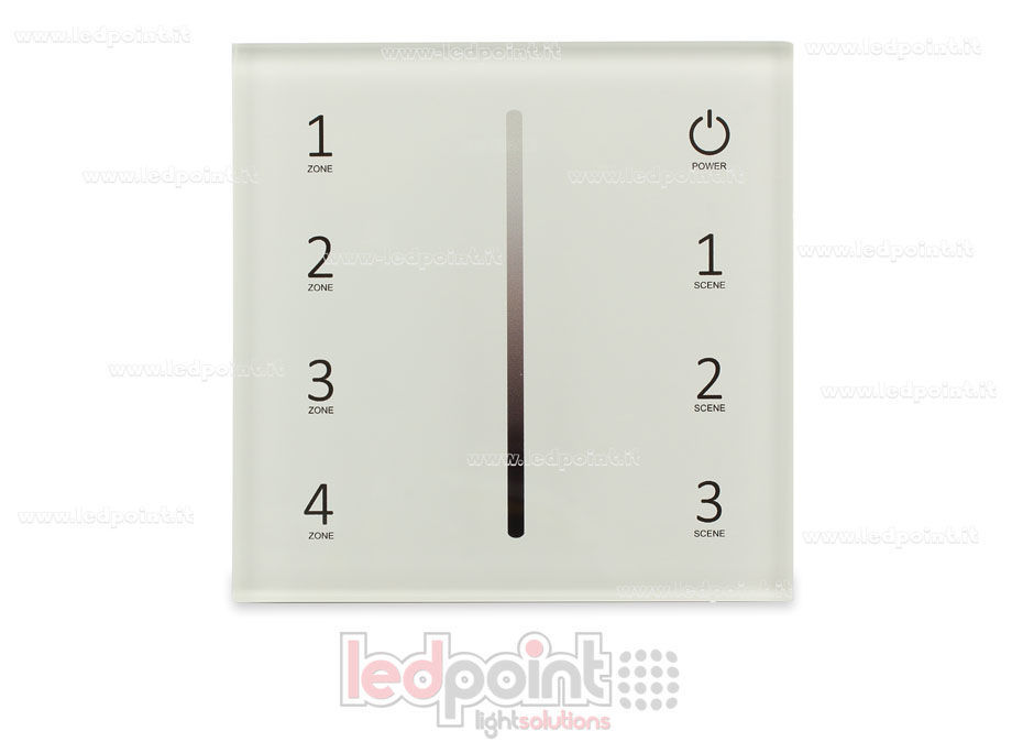 SISTEMAS SKYDANCE CATÁLOGO FAQ Regulador de pared táctil con 4 canales 0-10V. Permite regular fuentes de alimentación 0/1-10V. Compatible con todos los mandos a distancia RF monocromáticos.